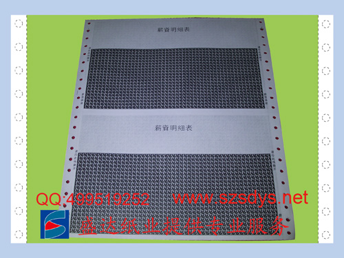 工藝:薪資單打印紙為一份三聯(lián)無碳紙,紙質(zhì)有55克及80克任客戶選擇,薪資單打印紙版面內(nèi)容可按客戶要求排版,印刷上單位標(biāo)志及單位名稱中英文、注意事項(xiàng)等要求內(nèi)容。常用尺寸為:93*217mm、140*241mm。四周通過有色膠粘接、正反面通過印刷保密底紋、保密效果好。通過對電腦紙涂膠粘合及相關(guān)部位的增感油墨或減感油墨的印刷,實(shí)現(xiàn)員工薪酬明細(xì)信息的保密。有多種版式、保密花紋可選用,通過針式打印機(jī)套打使用。薪資單打印紙具有無碳復(fù)寫、電腦連續(xù)打印、私人信息保密功能。為確保薪資單打印紙?jiān)趥鬟f或郵寄時(shí)的保密,收件人必需沿三邊刀位撕開此產(chǎn)品,方能審閱內(nèi)里的資料。
