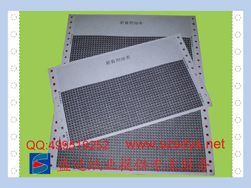 工藝:薪資通知單為一份三聯(lián)無(wú)碳紙,紙質(zhì)有55克及80克任客戶選擇,薪資通知單版面內(nèi)容可按客戶要求排版,印刷上單位標(biāo)志及單位名稱中英文、注意事項(xiàng)等要求內(nèi)容。常用尺寸為:93*217mm、140*241mm。四周通過(guò)有色膠粘接、正反面通過(guò)印刷保密底紋、保密效果好。通過(guò)對(duì)電腦紙涂膠粘合及相關(guān)部位的增感油墨或減感油墨的印刷,實(shí)現(xiàn)員工薪酬明細(xì)信息的保密。有多種版式、保密花紋可選用,通過(guò)針式打印機(jī)套打使用。薪資通知單具有無(wú)碳復(fù)寫、電腦連續(xù)打印、私人信息保密功能。為確保薪資通知單在傳遞或郵寄時(shí)的保密,收件人必需沿三邊刀位撕開(kāi)此產(chǎn)品,方能審閱內(nèi)里的資料。