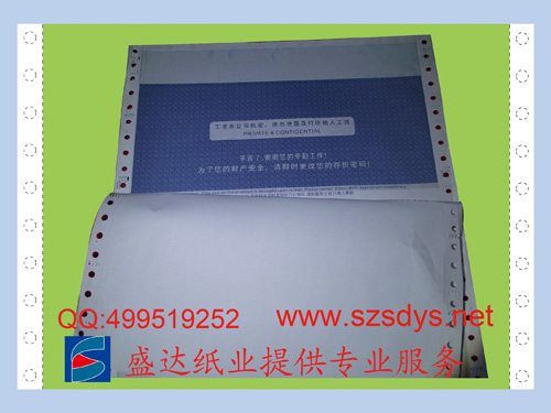 工藝:密封薪資條紙為一份三聯(lián)無碳紙,紙質(zhì)有55克及80克任客戶選擇,密封薪資條紙版面內(nèi)容可按客戶要求排版,印刷上單位標(biāo)志及單位名稱中英文、注意事項(xiàng)等要求內(nèi)容。常用尺寸為:93*217mm、140*241mm。四周通過有色膠粘接、正反面通過印刷保密底紋、保密效果好。通過對電腦紙涂膠粘合及相關(guān)部位的增感油墨或減感油墨的印刷,實(shí)現(xiàn)員工薪酬明細(xì)信息的保密。有多種版式、保密花紋可選用,通過針式打印機(jī)套打使用。密封薪資條紙具有無碳復(fù)寫、電腦連續(xù)打印、私人信息保密功能。為確保密封薪資條紙?jiān)趥鬟f或郵寄時(shí)的保密,收件人必需沿三邊刀位撕開此產(chǎn)品,方能審閱內(nèi)里的資料。