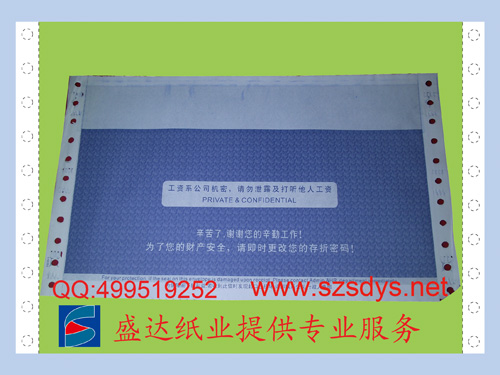 工藝:薪資通知條為一份三聯(lián)無(wú)碳紙,紙質(zhì)有55克及80克任客戶選擇,薪資通知條版面內(nèi)容可按客戶要求排版,印刷上單位標(biāo)志及單位名稱中英文、注意事項(xiàng)等要求內(nèi)容。常用尺寸為:93*217mm、140*241mm。四周通過(guò)有色膠粘接、正反面通過(guò)印刷保密底紋、保密效果好。通過(guò)對(duì)電腦紙涂膠粘合及相關(guān)部位的增感油墨或減感油墨的印刷,實(shí)現(xiàn)員工薪酬明細(xì)信息的保密。有多種版式、保密花紋可選用,通過(guò)針式打印機(jī)套打使用。薪資通知條具有無(wú)碳復(fù)寫、電腦連續(xù)打印、私人信息保密功能。為確保工資單紙?jiān)趥鬟f或郵寄時(shí)的保密,收件人必需沿三邊刀位撕開(kāi)此產(chǎn)品,方能審閱內(nèi)里的資料。