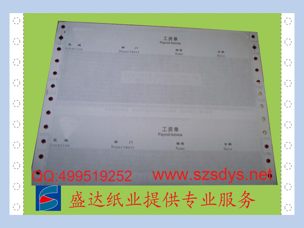 工藝:企業(yè)工資紙為一份三聯(lián)無碳紙,紙質(zhì)有55克及80克任客戶選擇,企業(yè)工資紙版面內(nèi)容可按客戶要求排版,印刷上單位標(biāo)志及單位名稱中英文、注意事項等要求內(nèi)容。常用尺寸為:93*217mm、140*241mm。四周通過有色膠粘接、正反面通過印刷保密底紋、保密效果好。通過對電腦紙涂膠粘合及相關(guān)部位的增感油墨或減感油墨的印刷,實現(xiàn)員工薪酬明細信息的保密。有多種版式、保密花紋可選用,通過針式打印機套打使用。企業(yè)工資紙具有無碳復(fù)寫、電腦連續(xù)打印、私人信息保密功能。為確保工資單紙在傳遞或郵寄時的保密,收件人必需沿三邊刀位撕開此產(chǎn)品,方能審閱內(nèi)里的資料。