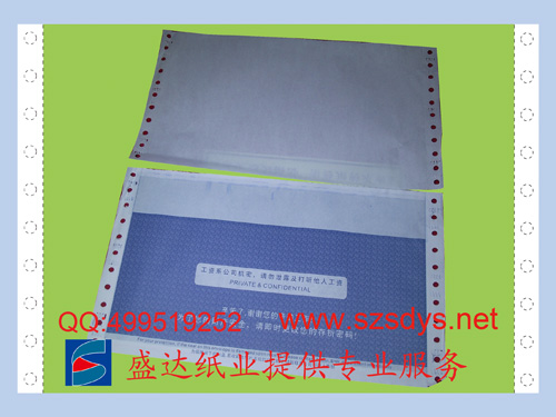 工藝:密碼工資紙為一份三聯(lián)無碳紙,紙質(zhì)有55克及80克任客戶選擇,密碼工資紙版面內(nèi)容可按客戶要求排版,印刷上單位標志及單位名稱中英文、注意事項等要求內(nèi)容。常用尺寸為:93*217mm、140*241mm。四周通過有色膠粘接、正反面通過印刷保密底紋、保密效果好。通過對電腦紙涂膠粘合及相關(guān)部位的增感油墨或減感油墨的印刷,實現(xiàn)員工薪酬明細信息的保密。有多種版式、保密花紋可選用,通過針式打印機套打使用。密碼工資紙具有無碳復(fù)寫、電腦連續(xù)打印、私人信息保密功能。為確保工資單紙在傳遞或郵寄時的保密,收件人必需沿三邊刀位撕開此產(chǎn)品,方能審閱內(nèi)里的資料。