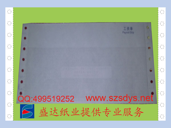 工藝:工資單打印紙為一份三聯(lián)無(wú)碳紙,紙質(zhì)有55克及80克任客戶(hù)選擇,工資單打印紙版面內(nèi)容可按客戶(hù)要求排版,印刷上單位標(biāo)志及單位名稱(chēng)中英文、注意事項(xiàng)等要求內(nèi)容。常用尺寸為:93*217mm、140*241mm。四周通過(guò)有色膠粘接、正反面通過(guò)印刷保密底紋、保密效果好。通過(guò)對(duì)電腦紙涂膠粘合及相關(guān)部位的增感油墨或減感油墨的印刷,實(shí)現(xiàn)員工薪酬明細(xì)信息的保密。有多種版式、保密花紋可選用,通過(guò)針式打印機(jī)套打使用。工資單打印紙具有無(wú)碳復(fù)寫(xiě)、電腦連續(xù)打印、私人信息保密功能。為確保工資單打印紙?jiān)趥鬟f或郵寄時(shí)的保密,收件人必需沿三邊刀位撕開(kāi)此產(chǎn)品,方能審閱內(nèi)里的資料。